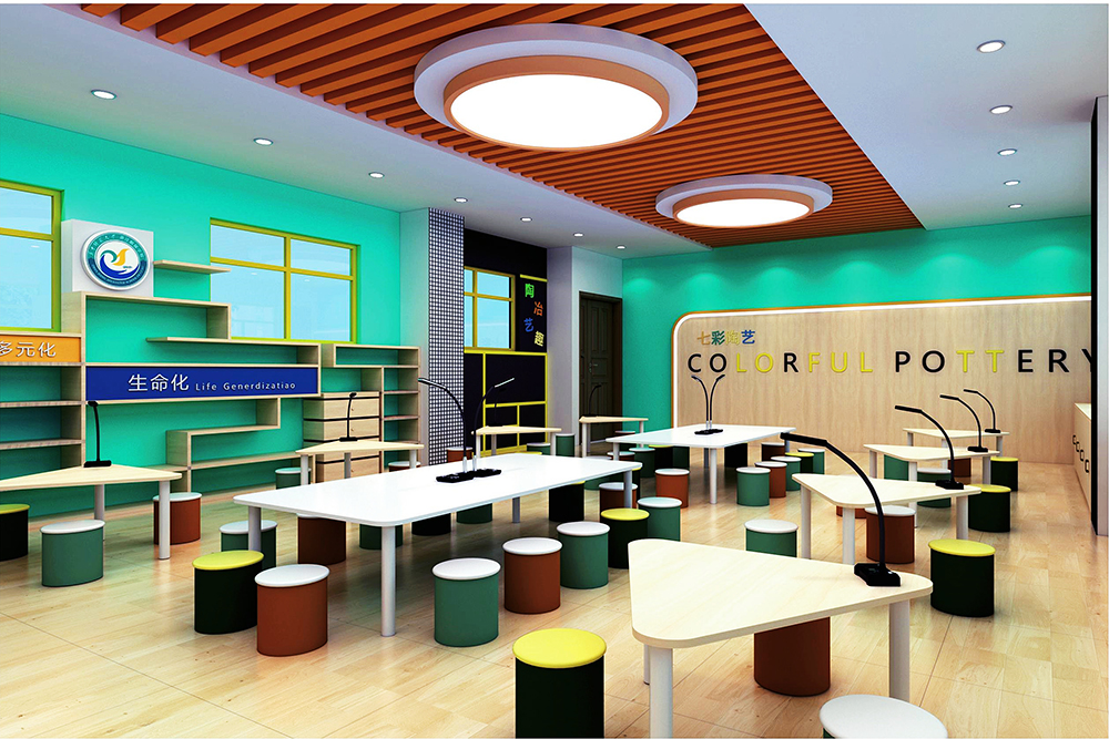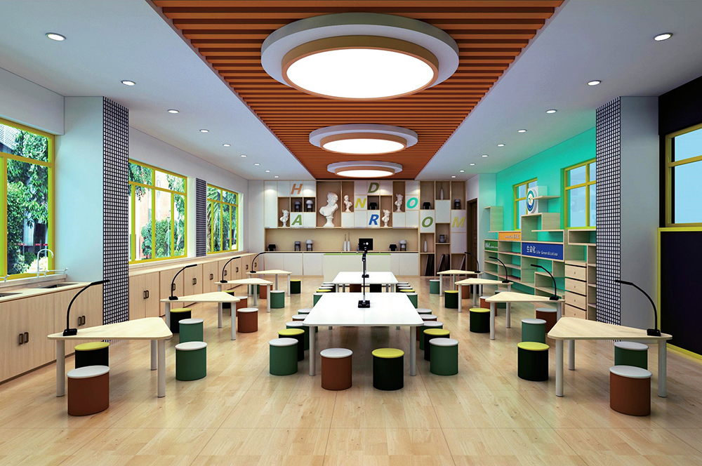 色彩鲜艳、光照充足的手工教室能够激发学生的创新意识,让他们更积极地进行手工活动。借助先进的教学设备,教师能够实现教学创新。因此,研究院在手工教室的设计中添加互动单元,将强交互智慧课堂加入到了手工课堂的教学中,进一步提高课堂的互动性。